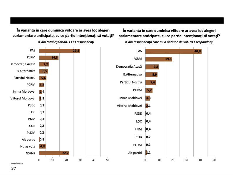 În eventualitatea organizării unor alegeri anticipate, actualul partid de guvernare, PAS, ar obține cele mai multe voturi, aproape 30%, arată datele unui nou sondaj IMAS Moldova.