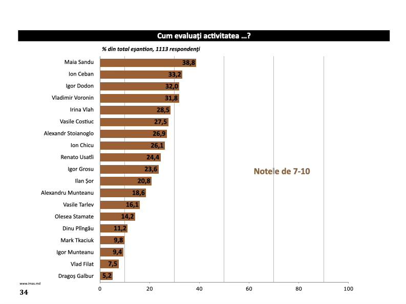 Potrivit datelor sondajului, activitatea președintei Maia Sandu a fost apreciată cu note de la 7 la 10 de către 38,8% dintre participanții la studiu. Pe locul doi se află primarul capitalei, Ion Ceban, cu 33,2%, urmat de fostul președinte al țării, Igor Dodon, cu 32%.