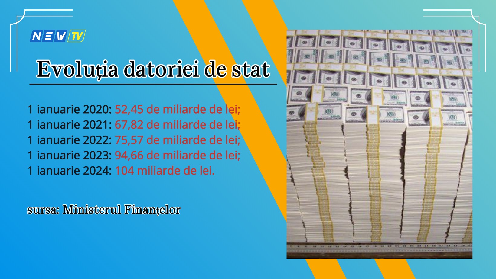 За последние пять лет государственный долг Республики Молдова увеличился вдвое (ГРАФИК 1) – с 52 миллиардов леев по состоянию на 1 января 2020 года до 104 миллиардов леев на 1 января 2024 года. Эти факты педалирует оппозиция, которая использует в своих оценках словосочетание "по уши в долгах". С другой стороны, правительство отмечает, что национальный государственный долг составляешь лишь одну отреть от общего объема национальной экономики, что не так много по сравнению с ситуацией в других государствах. И это дествительно так.