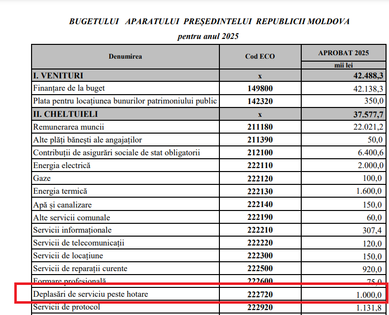 Potrivit Președinției, anul trecut instituția a cheltuit 800 de mii de lei pentru deplasări de serviciu peste hotarele țării. În bugetul alocat pentru anul 2025 în acest scop este prevăzut un milion de lei.