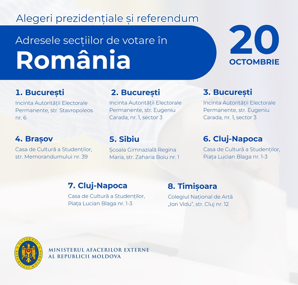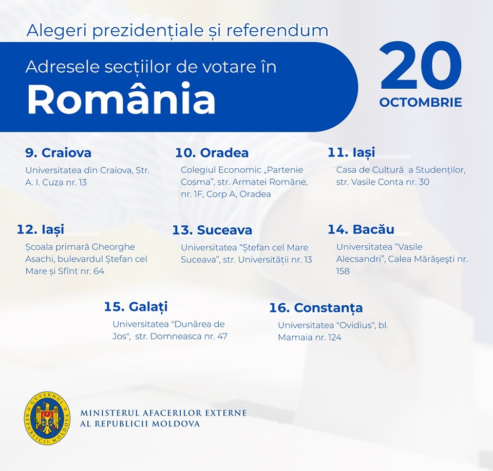 16 secţii de votare vor fi deschise în România pentru alegerile prezidenţiale şi referendumul din 20 octombrie. Un anunț în acest sens a fost făcut pe pagina de Facebook a Ambasadei Republicii Moldova la Bucureşti.