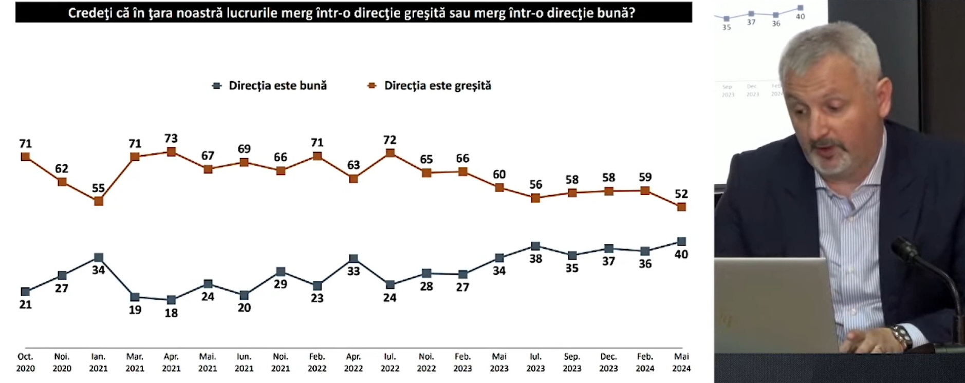 40 la sută din cetățeni consider că lucrurile în Republica Moldova se îndreaptă într-o direcție bună. Acesta este cel mai optimist răspuns din ultimii patru ani, potrivit sondajului ”Barometrul socio-politic – mai 2024”, prezentat astăzi de IMAS, la comanda Independent News din România.