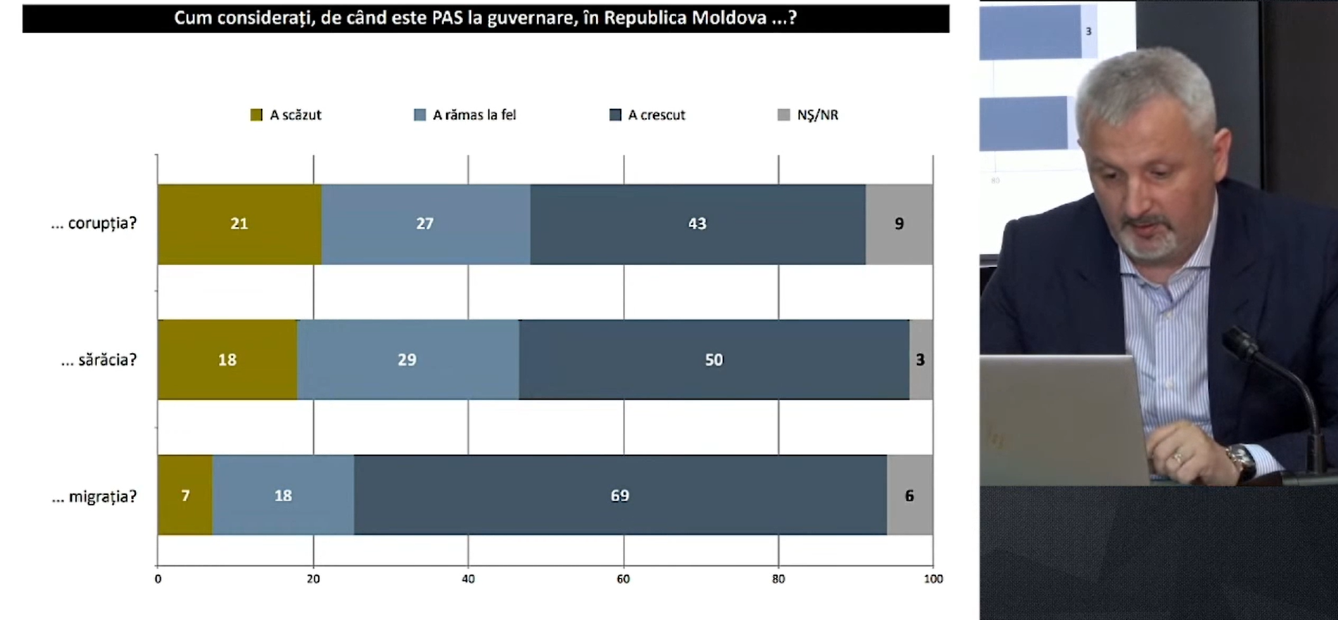 70 la sută din cetățeni consideră că, în această perioadă, nivelul corupției a rămas la fel s-au a crescut, iar 79 spun că sărăcia a rămas la fel sau a crescut, iar 87 la sută consideră că migrația pe timpul PAS a rămas la fel sau a crescut. 20 la sută din cetățeni își văd viitorul mai degrabă peste hotare, iar 48 la sută consideră că, în mare și foarte mare măsură, președintele Maia Sandu este responsabilă pentru situația din țară.