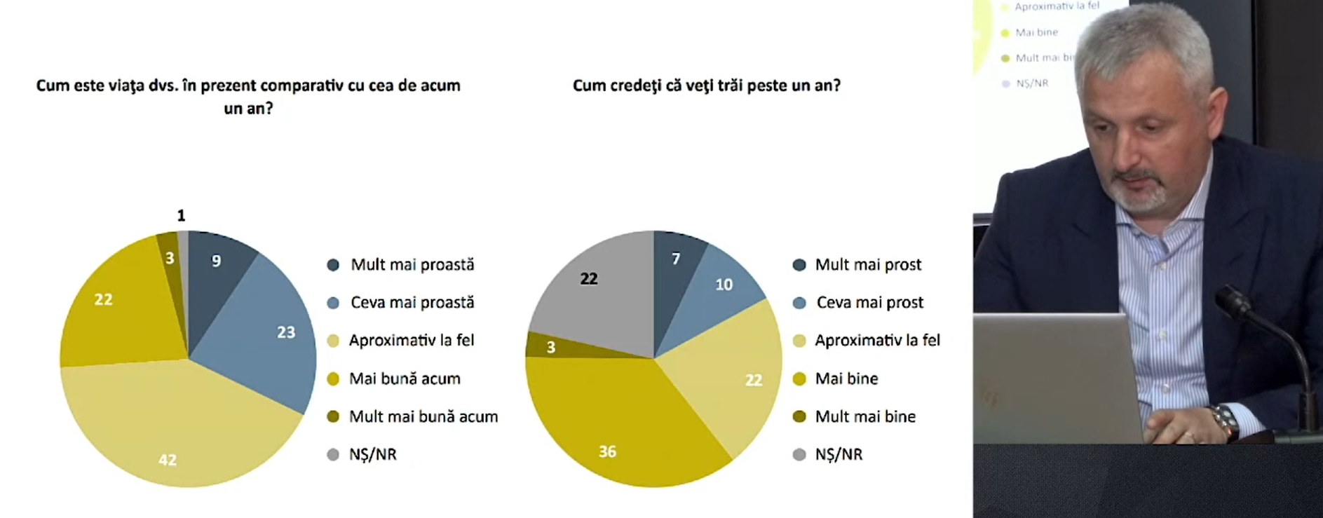 Totuși, 74 la sută din intervievați spun că, față de anul trecut, viața lor fie nu s-a schimbat, fie s-a schimbat în rău. 39 la sută consideră că așa va fi și peste un an.