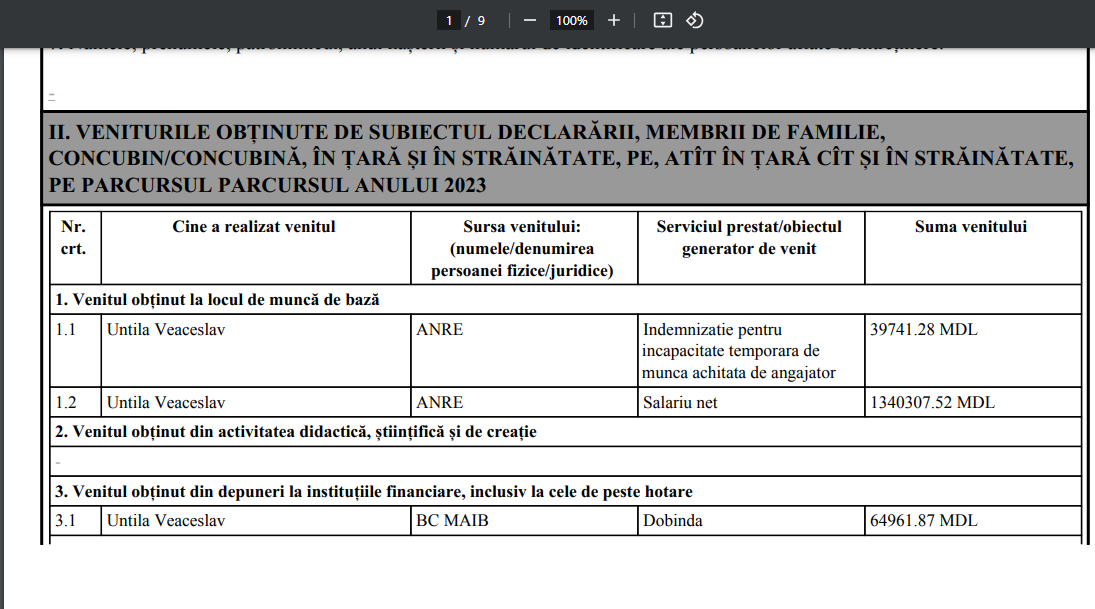 Anul trecut, directorul general al ANRE a încasat un salariu net, adică fără impozite, de un milion și 340 de mii de lei. Pe lângă acesta, de la Casa Națională de Asigurări Sociale a primit o pensie de peste 174 de mii de lei. Unul dintre membrii familiei sale, pe care nu l-a indicat, a beneficiat în același an de o pensie de peste 176 de mii de lei. De asemenea, Veaceslav Untila a primit aproape 40 de mii de lei de la ANRE și 3.230 de lei de la CNAS drept indemnizații pentru incapacitate temporară de muncă. Tot de la CNAS i-au intrat în cont o alocație de stat de 11.250 de lei și o alocație nominală de 6.000 de lei. Alte aproape 65 de mii de lei iau venit directorului general al ANRE din dobânzile depozitelor bancare. La acest capitol, creșterea este de peste patru ori față de dobânda de 13.900 de lei, declarată în 2022.