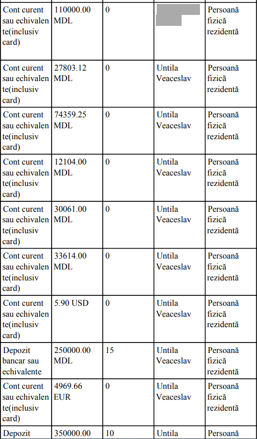 Veaceslav Untila a declarat opt conturi curente în două bănci de la Chișinău și unul la București. Apropo, cel din urmă, în care deține 158 de mii de RONi sau peste 607 mii de lei moldovenești nu figurează în declarația de avere și interese pentru anul 2022. Șase din cele opt conturi curente deschise în băncile de la Chișinău sunt în monedă națională. În ele figurează sume între 110 mii și 12 mii de lei. Două conturi sunt în valută – euro și dolari, în valoare totală de aproape 5.000 de euro. A indicat Veaceslav Untila și două depozite – cu 350 de mii și, respectiv, 250 de mii de lei.