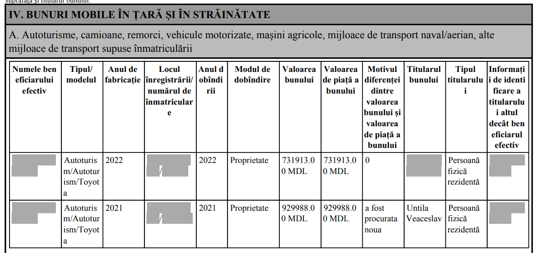 Pentru 2021 și 2022, Veaceslav Untila declară achiziția a două automobile de lux, în valoare de 930 de mii și, respectiv, 732 de mii de lei, adică mai scumpe decât cele două apartamente. Unul dintre membrii familiei sale deține acțiuni de 600 de mii de lei într-o societate de asigurări și cotă-parte de 43 de mii de lei într-o agenție imobiliară.