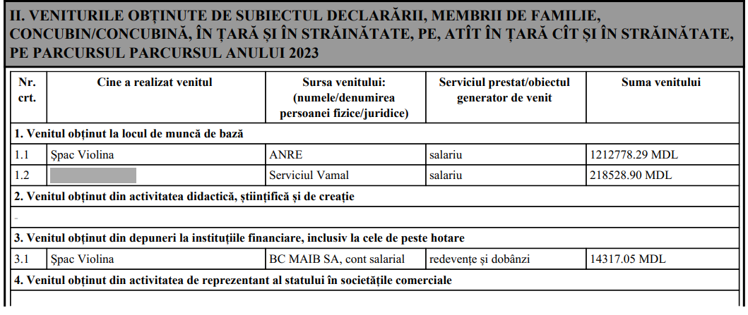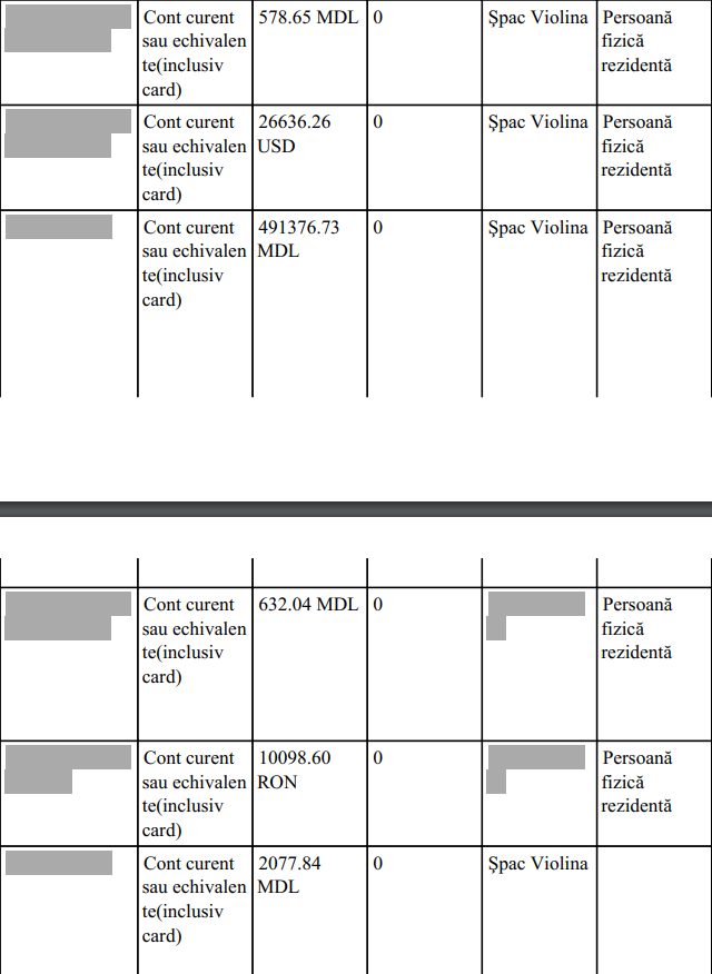 Pentru anul trecut, Violina Șpac a ridicat de la locul de muncă un salariu de peste un milion 212 mii de lei. Pentru soț, angajat al Serviciului Vamal, a indicat o remunerare de peste 218 mii de lei. Mai mult de 14 mii de lei Violina Șpac a primit de la bancă drept dobândă pentru contul salarial.