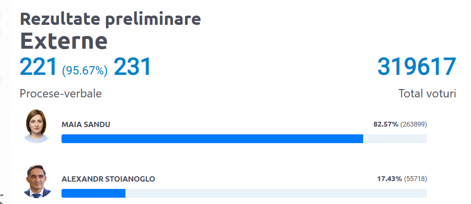 Potrivit rezultatelor preliminare, la scrutinul prezidențial din 3 noiembrie, Maia Sandu a obținut victoria cu 55,3%, iar Alexandr Stoianoglo s-a clasat pe locul doi cu 44,68%.
