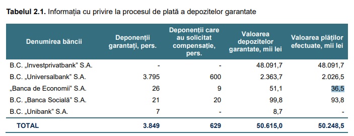 Fondul de garantare a depozitelor în sistemul bancar a efectuat, de la fondare, în 2004, plăți de 50 de milioane 248,5 mii de lei. Mai mult de 48 de milioane de lei le-au revenit deponenților ”Investrivatbank”, iar mai mult de două milioane – celor de la ”Universalbank”. Deponenții ”Băncii de Economii” au primit doar 36,3 mii de lei, iar cei ai ”Băncii Sociale” – 93,8 mii de lei, scrie ZVON.MD.
