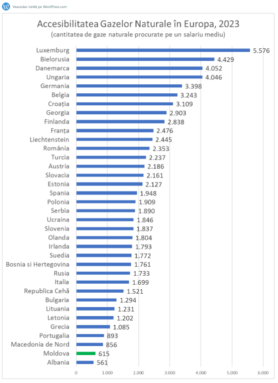 Potrivit calculelor, cu salariul mediu din țara noastră pot fi cumpărați 615 metri cubi de gaze naturale. La acest capitol, Moldova se clasează pe locul 35 din 36 de țări. Doar albanezii stau mai prost, deoarece leafa medie din această țară permite cumpărarea a 561 metri cubi. În România, acest indicator a fost de aproape patru ori mai bun decât în Moldova, notează Ioniță, cu referire la situația din 2023.