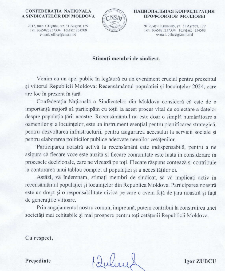 ”Confederația Națională a Sindicatelor din Moldova consideră că este de o importanță majoră să participăm cu toții la acest proces vital de colectare a datelor despre populația țării noastre. Recensământul nu este doar o simplă numărătoare a oamenilor și a locuințelor, este un instrument esențial pentru planificarea strategică, pentru dezvoltarea infrastructurii, pentru asigurarea accesului la servicii sociale și pentru elaborarea politicilor publice adecvate nevoilor cetățenilor”, se arată într-o adresare publică a CNSM.