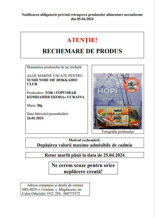 Agenția Națională pentru Siguranța Alimentelor (ANSA) a identificat un lot de alge marine uscate pentru sushi, contaminate cu cadmiu, un metal greu dăunător sănătății.