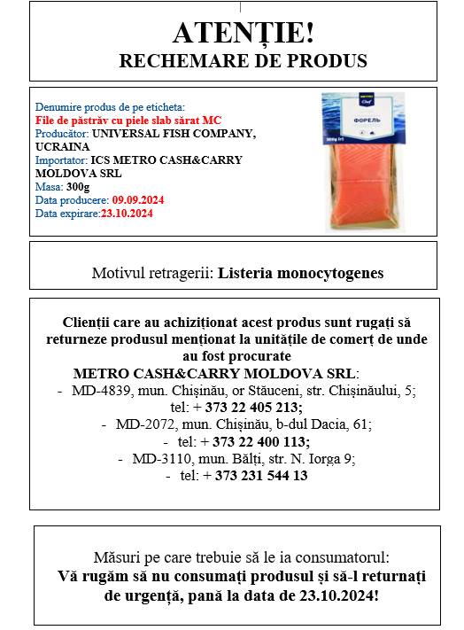 Consumatorii sunt îndemnați să nu consume produsul și să îl returneze la unitățile de unde l-au cumpărat. Este vorba despre file de păstrăv cu piele slab sărat MC, de 300 gr, producător Universal Fish Company, Ucraina. Data producerii produsului rechemat este 09.09.2024, iar data expirării 23.10.2024.
