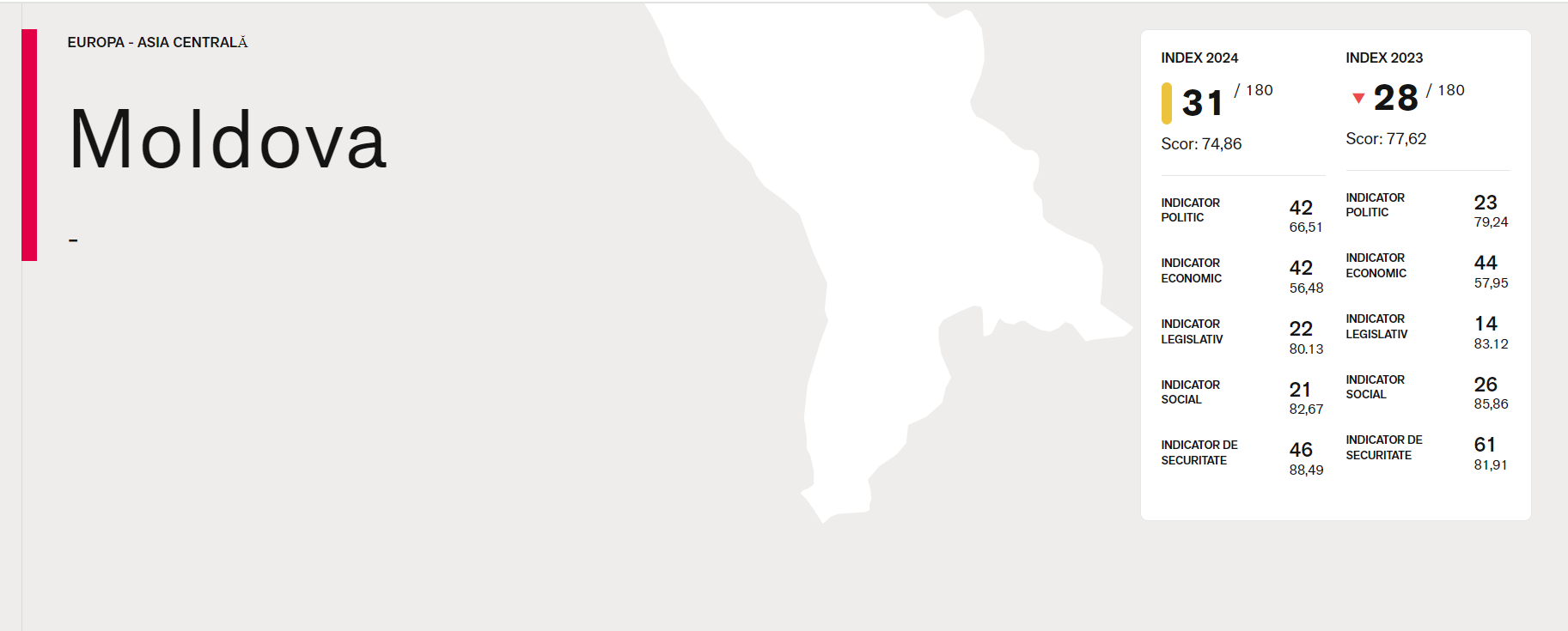 Republica Moldova a coborât trei poziții în topul privind libertatea presei pentru anul 2024 și s-a situat pe locul 31 conform indexului anual realizat de organizația Reporteri Fără Frontiere (RSF),cu sediul la Paris.