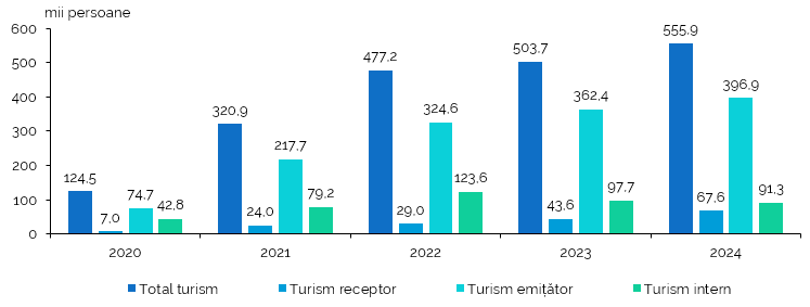 Biroul Național de Statistică informează că în anul 2024 numărul de turiști de diferite categorii a fost de 555,9 mii de persoane, cu 10,4% mai mult față de anul 2023.
