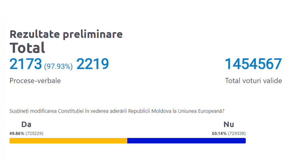 Rezultatele preliminare la referendum republican constituional după numărarea a 97 % din procese-verbale arată că 49,86% din alegători s-au expus pentru aderarea Moldovei la UE, iar 50,14% - împotrivă.