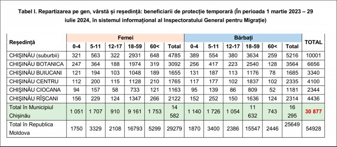 Tot mai mulți cetățeni refugiați din Ucraina solicită statutul de protecție temporară pe teritoriul Republicii Moldova. Potrivit Inspectoratului General pentru Migrație (IGM),în total, în Republica Moldova, 54.928 de cetățeni refugiați din Ucraina au statut de protecție temporară. Dintre aceștia 30.877 de persoane sunt stabilite în Municipiul Chișinău.