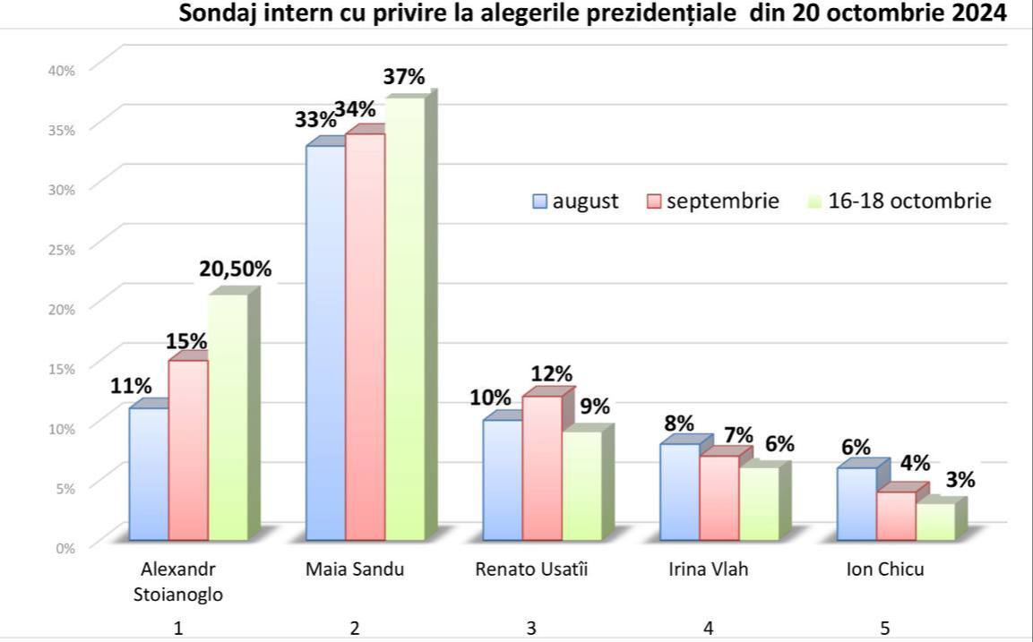 Igor Dodon face referire la datele unui sondaj intern. Acestea arată că, din luna august, ratingul politic al lui Alexandr Stoianoglo a crescut de la 11 la sută la 20,5 la sută. Pe primul lor este candidata PAS, Maia Sandu, care, de asemenea, și-a sporit popularitatea. Față de luna august, când avea un rating de 33 la sută, aceasta a adăugat patru puncte procentuale în octombrie. Ceilalți candidați vizați de sondajul intern al PSRM au pierdut din rating. Potrivit datelor publicate de liderul socialiștilor, popularitatea lui Renato Usatîi a scăzut de la 10 la sută la 9 la sută, în timp ce a Irinei Vlah – de la 8 la sută la 6 la sută. Candidatul PDCM, Ion Chicu, ar fi pierdut jumătate din rating – de la șase la sută a coborât până la trei la sută, potrivit acelorași date.