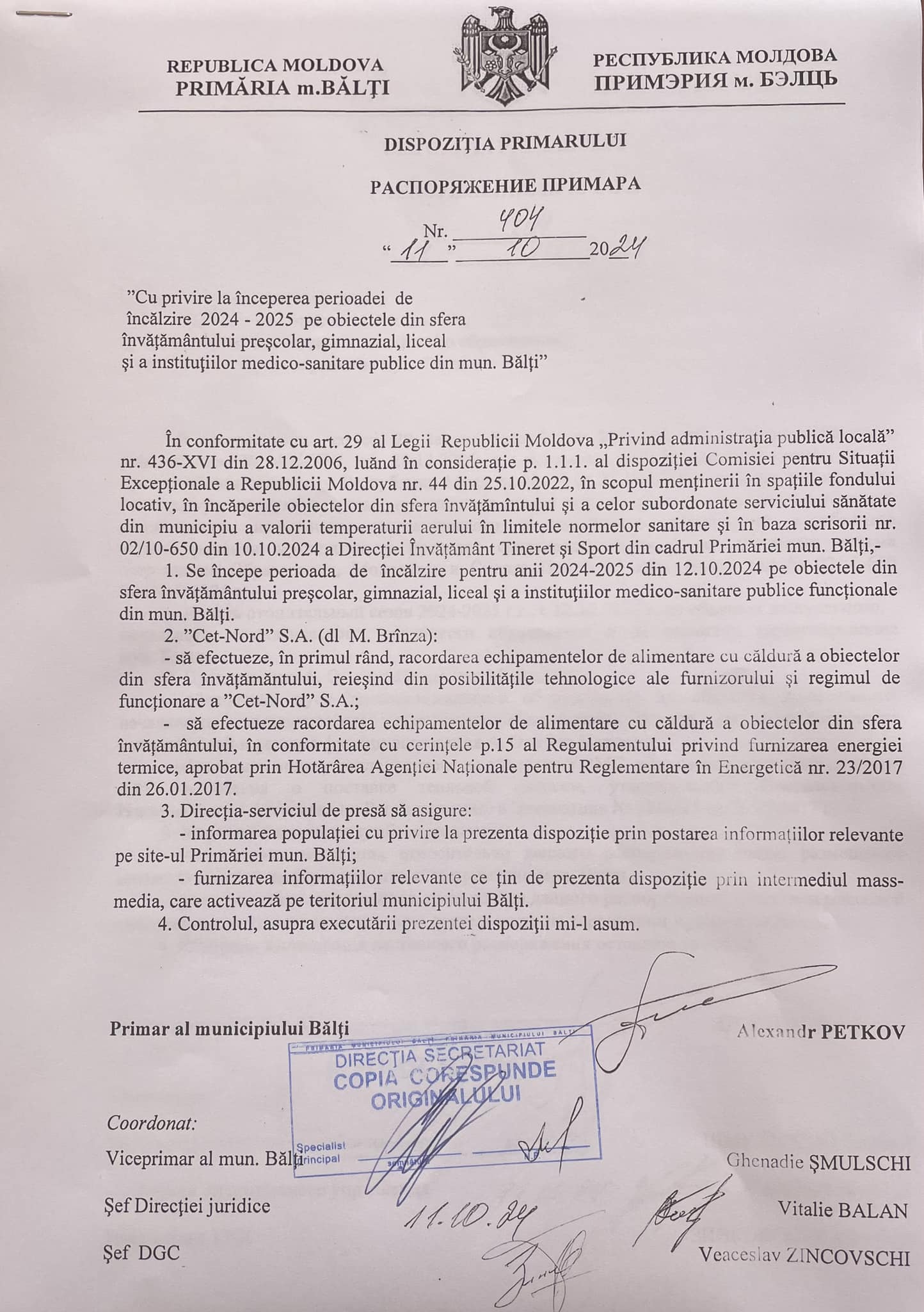 Însă, deocamdată, de căldură vor avea parte doar școlile, grădinițele, dar și instituțiile medicale. O dispoziție în acest sens a fost semnată vineri, 11 octombrie, de către primarul de Bălți, Aleksandr Petkov.