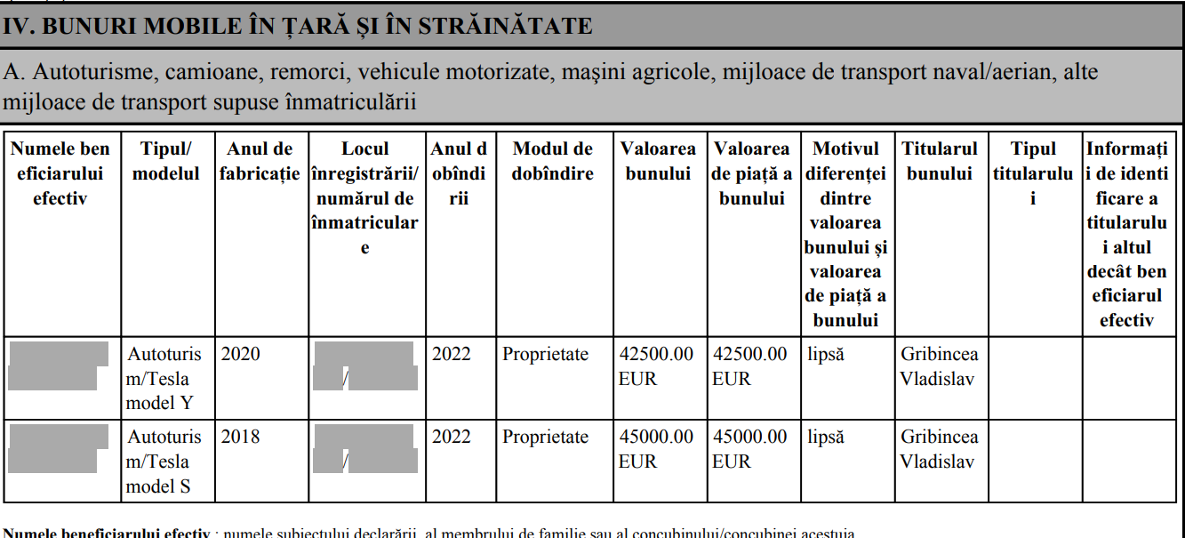 Potrivit declarației de avere, familia Gribincea deține două automobile marca Tesla: un model Y din 2020 care ar costa 42 500 de euro și un automobil de model S, pe care îl vinde. Cel de-al doilea este fabricat în 2018, iar valoarea de piață ar fi de 45 de mii de euro.