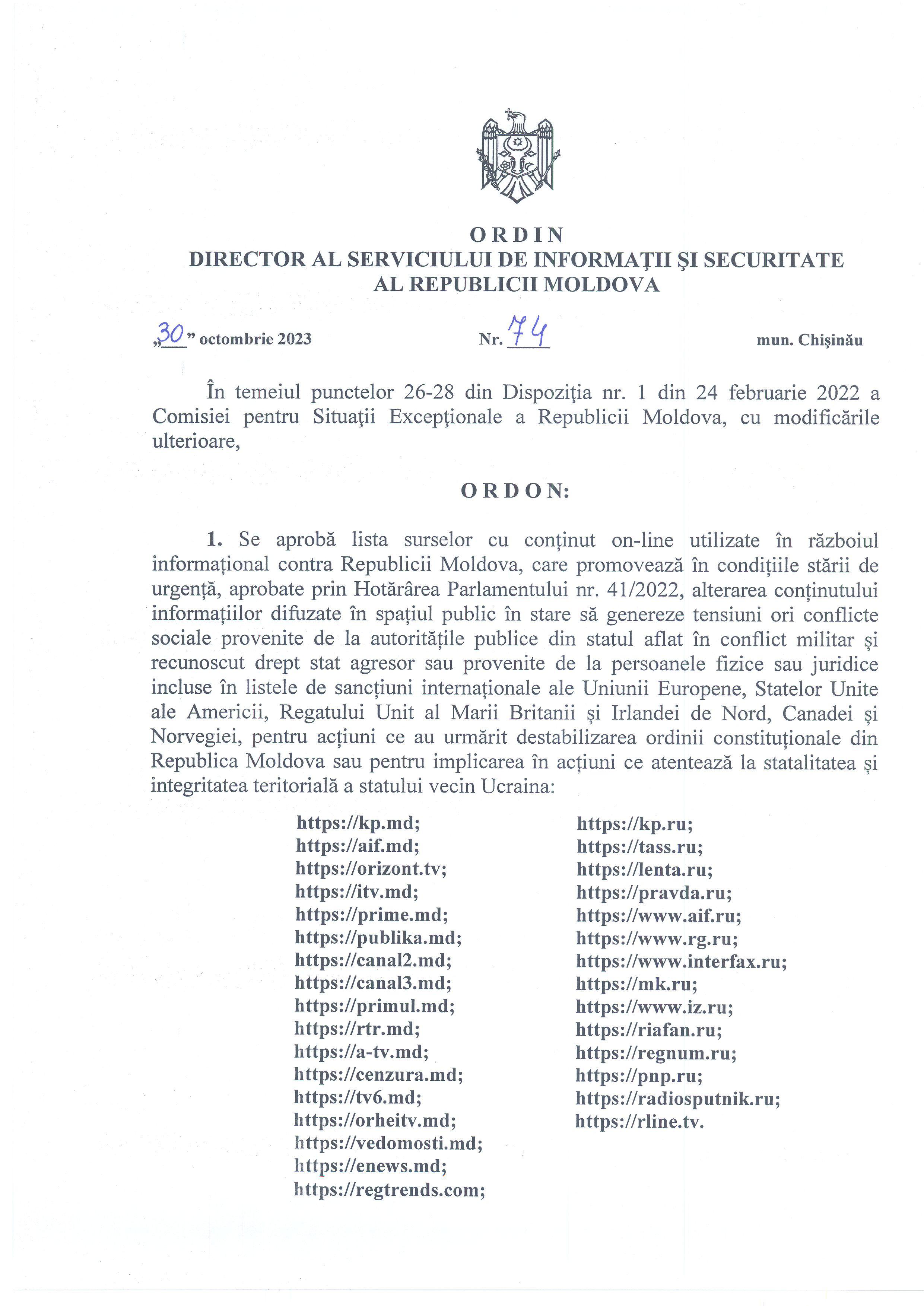 Pe de altă parte, rămân blocate site-urile moldovenești, care au fost închise la pachet cu cele rusești, sub același pretext. Ordinul privind închiderea celor peste 30 de portaluri conține indicații cu caracter obligatoriu. El le-a fost transmis furnizorilor de rețea și/sau servicii de comunicații electronice, pentru a bloca imediat, în condițiile prevederilor Dispoziției nr.1/2022 a Comisiei Situații Excepționale, accesul utilizatorilor din Republica Moldova la sursele menționate.