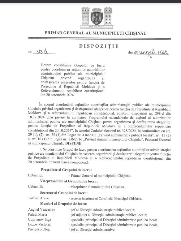 Primarul Capitalei, Ion Ceban, a semnat dispoziția privind constituirea Grupului de lucru pentru coordonarea acțiunilor autorităților administrației publice ale municipiului Chișinău privind organizarea și desfășurarea alegerilor pentru funcția de Președinte al Republicii Moldova și a Referendumului republican constituțional din 20 octombrie 2024.