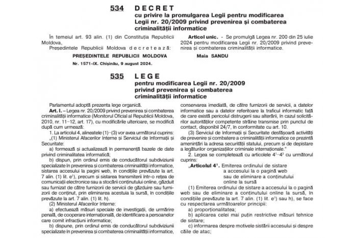 Decretul de promulgare și Legea privind prevenirea și combaterea criminalității informatice au fost publicate în numărul de astăzi, 15 august, al Monitorului Oficial, comunică MOLDPRES.