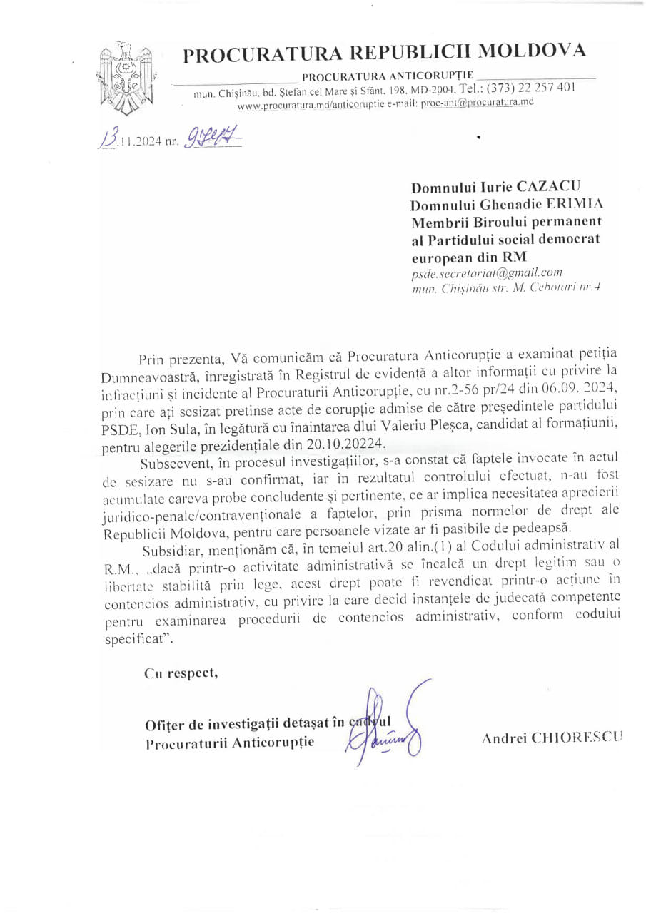 Procuratura Anticorupţie a stabilit că pretinsele acte de corupţie imputate preşedintelui PSDE, Ion Sula, în procesul de înaintare a lui Valeriu Plesca în calitate de candidat al PSDE la funcţia de preşedinte al Republicii Moldova, nu s-au adeverit. Procuratura a examinat un demers în acest sens depus de membrii Biroului Permanent al PSDE, Cazacu Iurie şi Erimia Ghenadie.