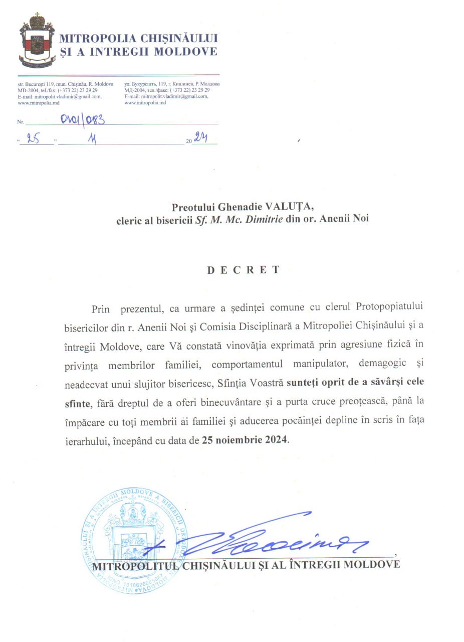 Preotul Ghenadie Valuța, clericul bisericii "Sf. M. Mc. Dimitrie" din orașul Anenii Noi, a fost oprit să oficieze slujbe din 25 noiembrie 2024. Anunțul a fost făcut de Mitropolia Moldovei.