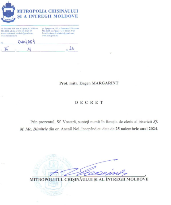 Totodată, Mitropolia Moldovei a anunțat că în locul lui Ghenadie Valuța, din 25 noiembrie, preotul mitr. Eugen Margarint a fost numit în funcția de cleric al bisericii "Sf. M. Mc. Dimitrie" din Anenii Noi.