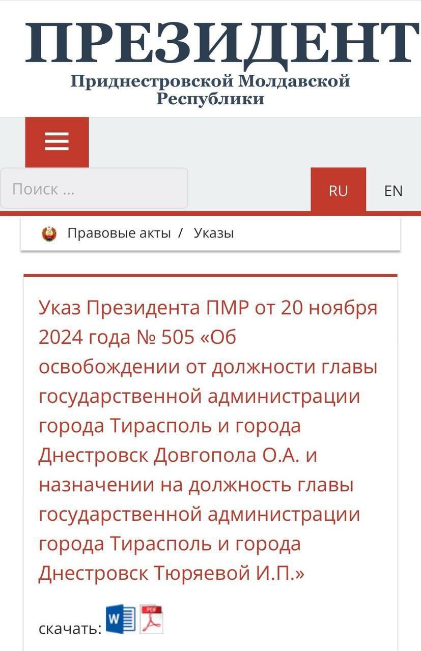 Primarul orașului Tiraspol, Oleg Dovgopol, a fost demis. În locul acestuia, în funcție a fost numită Ilona Tiureaeva.
