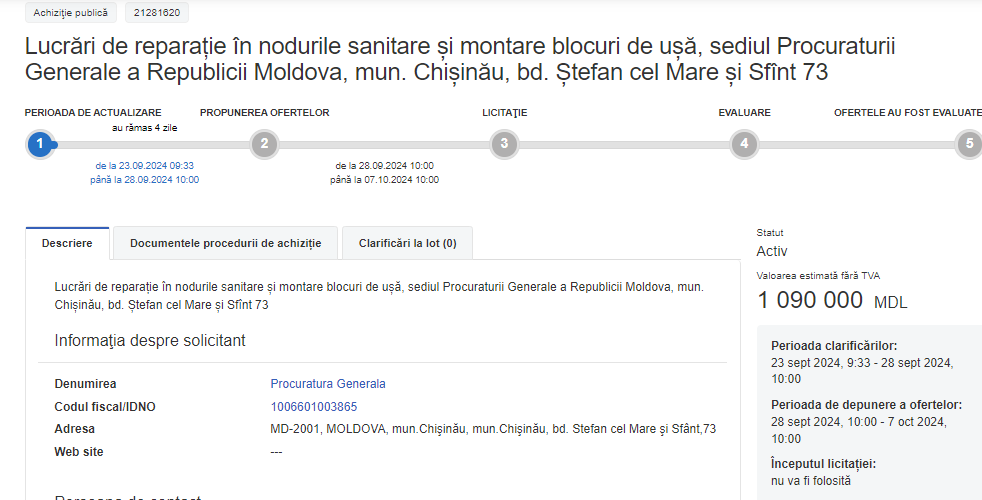 Procuratura Generală a anunțat licitație pentru lucrări de reparație a blocului sanitar. Potrivit anunțului publicat pe site-ul achizitii.md, camerele de baie vor fi dotate cu uscătoare și oglinzi. Tot aici vor fi schimbate pardoselile, ușile, geamurile, va fi reparat tavanul.