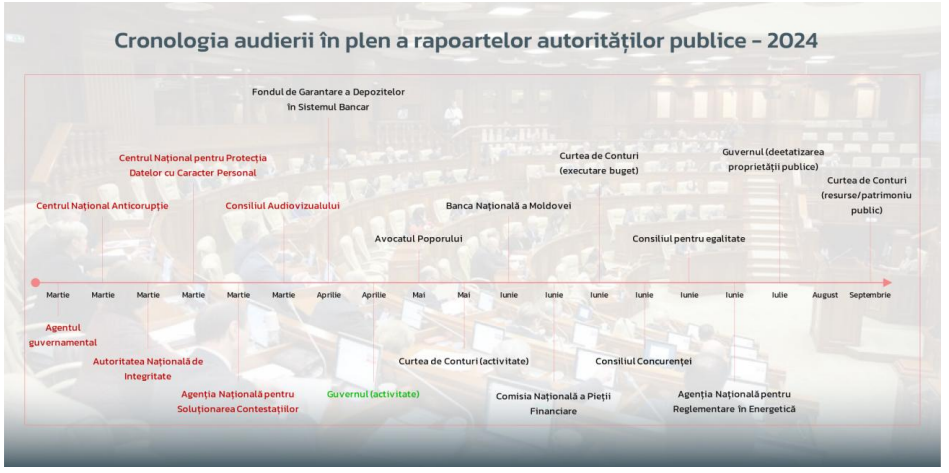 Mai mult, până la data de 31 martie urmau să fie audiate în plen rapoartele a 6 autorități, însă propunerile de audiere a acestora nu s-au regăsit pe ordinea de zi a ședințelor desfășurate în luna martie.