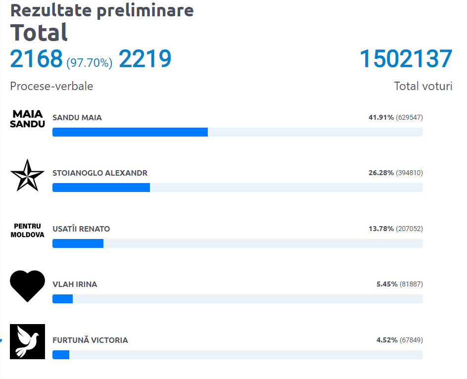 Rezultate preliminare la prezidențiale după numărarea a 97 % din procese-verbale arată că Maia Sandu și Alexandr Stoianoglo se vor confrunta în turul doi de scrutin. Candidatul PAS are, la această oră, un scor de 41,91%, iar Alexandr Stoianoglo – 26,28%.