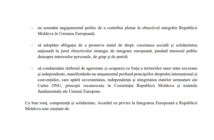 Pe rețelele de socializare a apărut schița viitoarei declarații, în care se menționează că semnatarii sunt conștienți de faptul că Republica Moldova, ”în calitatea sa de stat candidat, este obligată să întrunească fără nicio abatere Criteriile de la Copenhaga, inclusiv cele privind obligația de a dispune de o administrație publică competentă, meritocratică și bine organizată”.