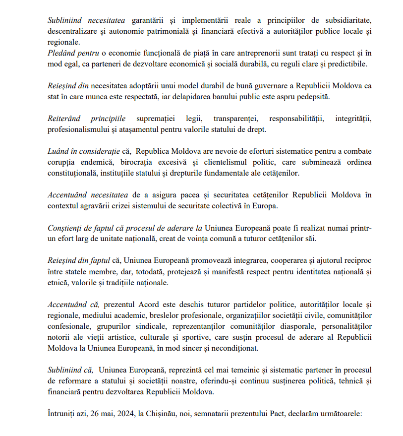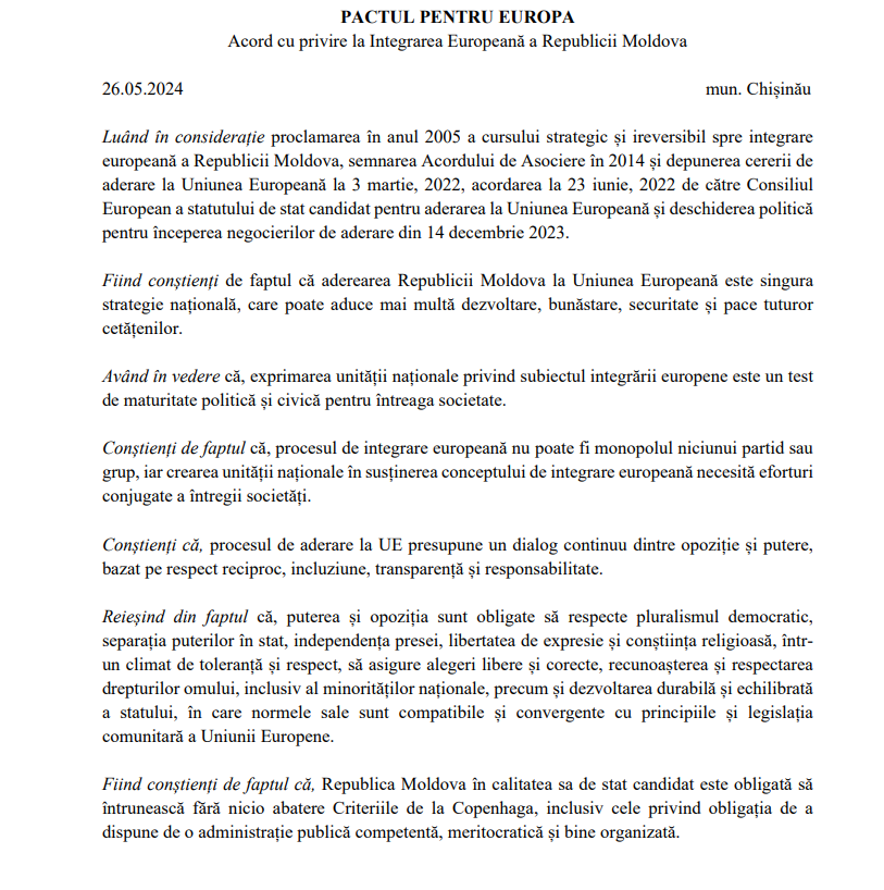 15 formațiuni politice, inclusiv partidul de guvernământ, planifică să semneze, duminică, un document în sprijinul integrării europene a Republicii Moldova. Așa-zisul pact pentru Europa ar fi inițiativa Partidului Mișcarea Alternativă Națională a primarului general al capitalei.
