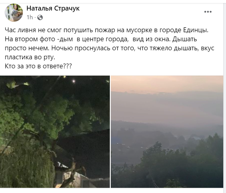 O altă locuitoare a orașului spune că nici ploaia, care a durat aproape o oră, nu a reușit să stingă focul de la gunoiște. ”Nu mai avem cu ce respira. Noaptea m-am trezit de la faptul că nu aveam cu ce să respir, simțeam gustul de plastic topit”, scrie Natalia Straciuc.