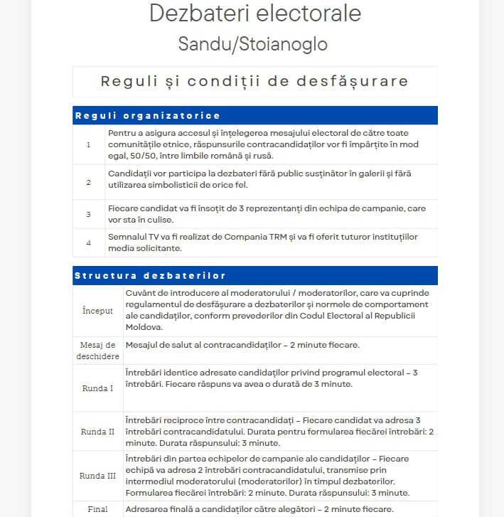 Dezbaterile vor începe cu un cuvânt de introducere din partea moderatorului/moderatorilor, care se va referi la regulamentul de desfășurare a dezbaterilor și normele de comportament ale candidaților, conform prevederilor din Codul Electoral al Republicii Moldova.