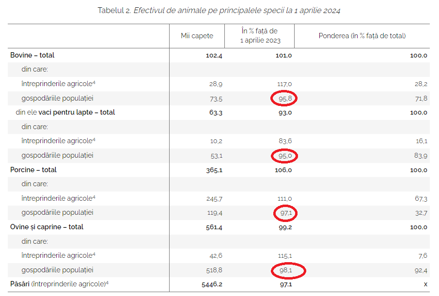 Față de 1 aprilie 2023, întreprinderile agricole au majorat numărul animalelor, cu excepția vacilor pentru lapte și păsărilor, în timp ce gospodăriile populației au micșorat șeptelul și numărul păsărilor.