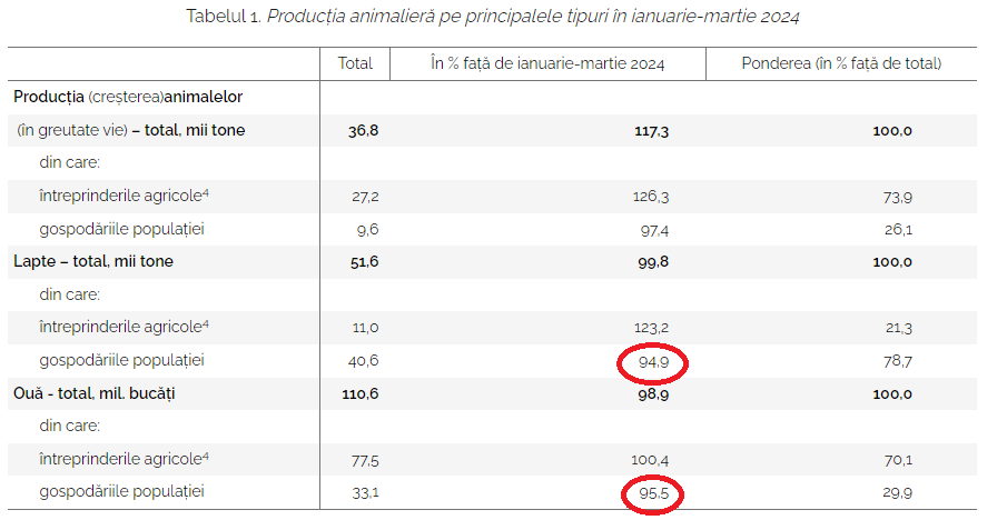 De asemenea, în timp ce întreprinderile agricole au majorat cu 23 la sută producția de lapte, aceasta a scăzut cu 5 la sută în gospodăriile populației. Și producția ouălor s-a diminuat cu un procent, din cauza gospodăriilor populației, care au micșorat producția cu 4,5 la sută. Întreprinderile agricole au majorat-o cu 0,4 la sută.