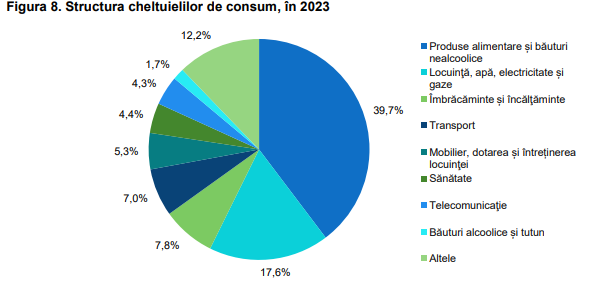 BNS menționează că cea mai mare parte a cheltuielilor a fost destinată acoperirii necesarului de consum alimentar. Aproape 40 la sută din cheltuieli au fost orientate spre acest capitol. În cazul sătenilor, ponderea cheltuielilor pentru produsele alimentare a depășit 45 la sută, în timp ce orășenii au cheltuit 35 la sută din venituri pentru alimente. Urmează cheltuielile pentru locuință, apă, electricitate și gaze naturale, care au înghițit 17,6 la sută din cheltuieli, iar pentru îmbrăcăminte și transport au fost alocate 7,8 la sută și, respectiv, șapte la sută. Celelalte cheltuieli au avut drept destinație procurarea de mobilier, dotarea și întreținerea locuinței - 5,3 la sută, sănătate - 4,4 la sută și telecomunicații - 4,3 la sută etc.