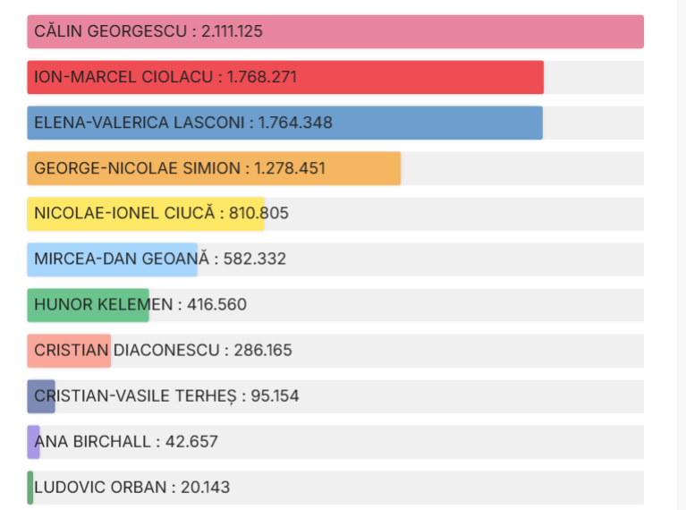 Marcel Ciolacu, candidatul PSD, se află pe poziţia a doua, cu 19,83% din voturile exprimate la primul tur de scrutin, iar Elena Lasconi, candidatul USR, se află pe poziţia a treia, cu 18,55%.