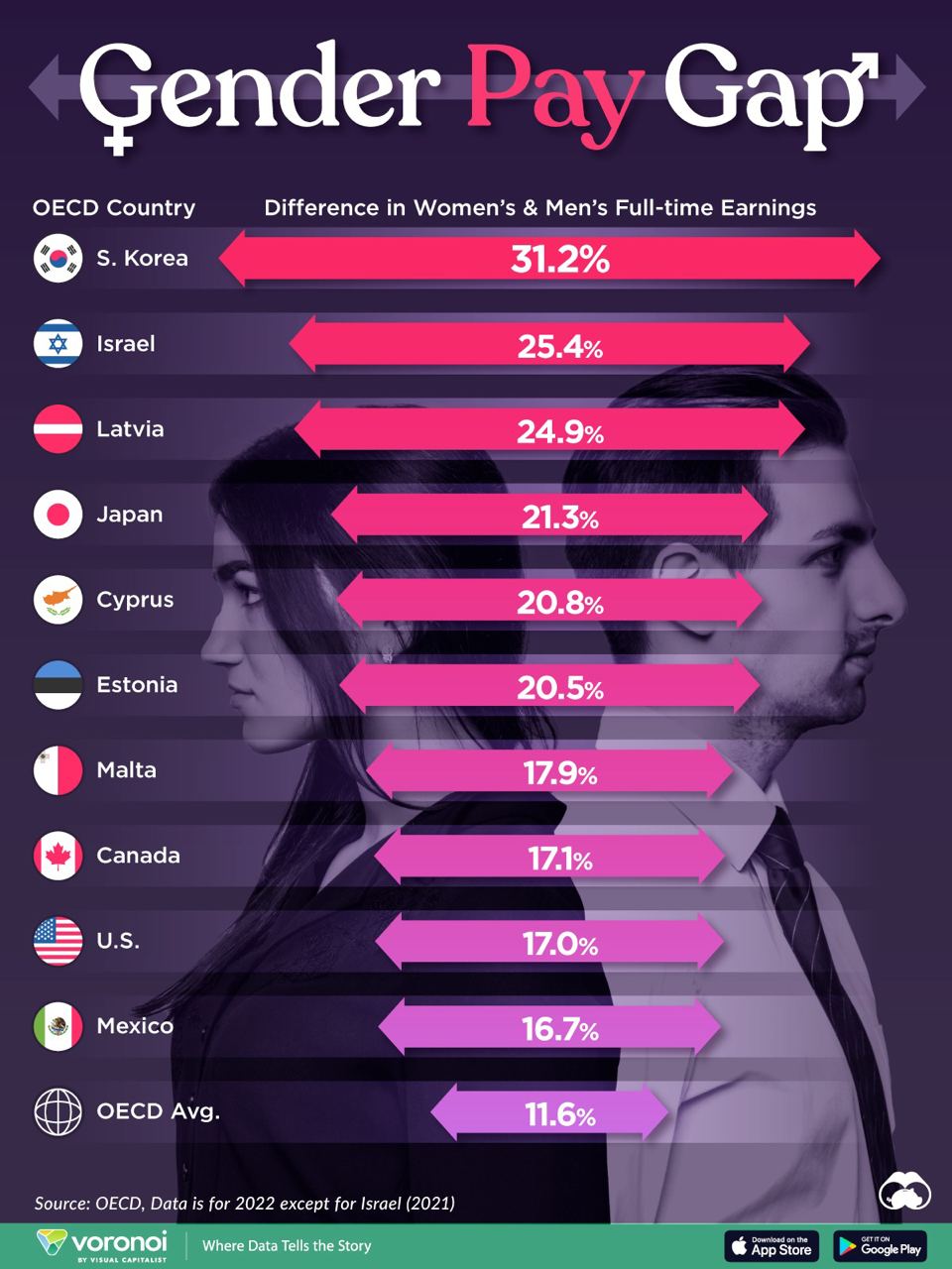 Potrivit datelor Organizației pentru Cooperare și Dezvoltare Economică, lefurile bărbaților în Coreea de Sud sunt, în medie, cu 31 la sută mai mari față de cele ale femeilor. În Israel și Letonia diferența ajunge la un sfert, iar în Japonia, Cipru și Estonia depășește 20 la sută.