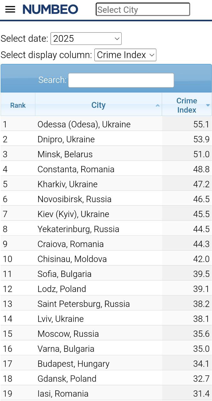 Numbeo a realizat un nou clasament al celor mai criminale orașe din lume pentru începutul anului 2025. Astfel, Chișinăul are un indice de 42 în acest rating și ocupă locul 216 din 380 de orașe.