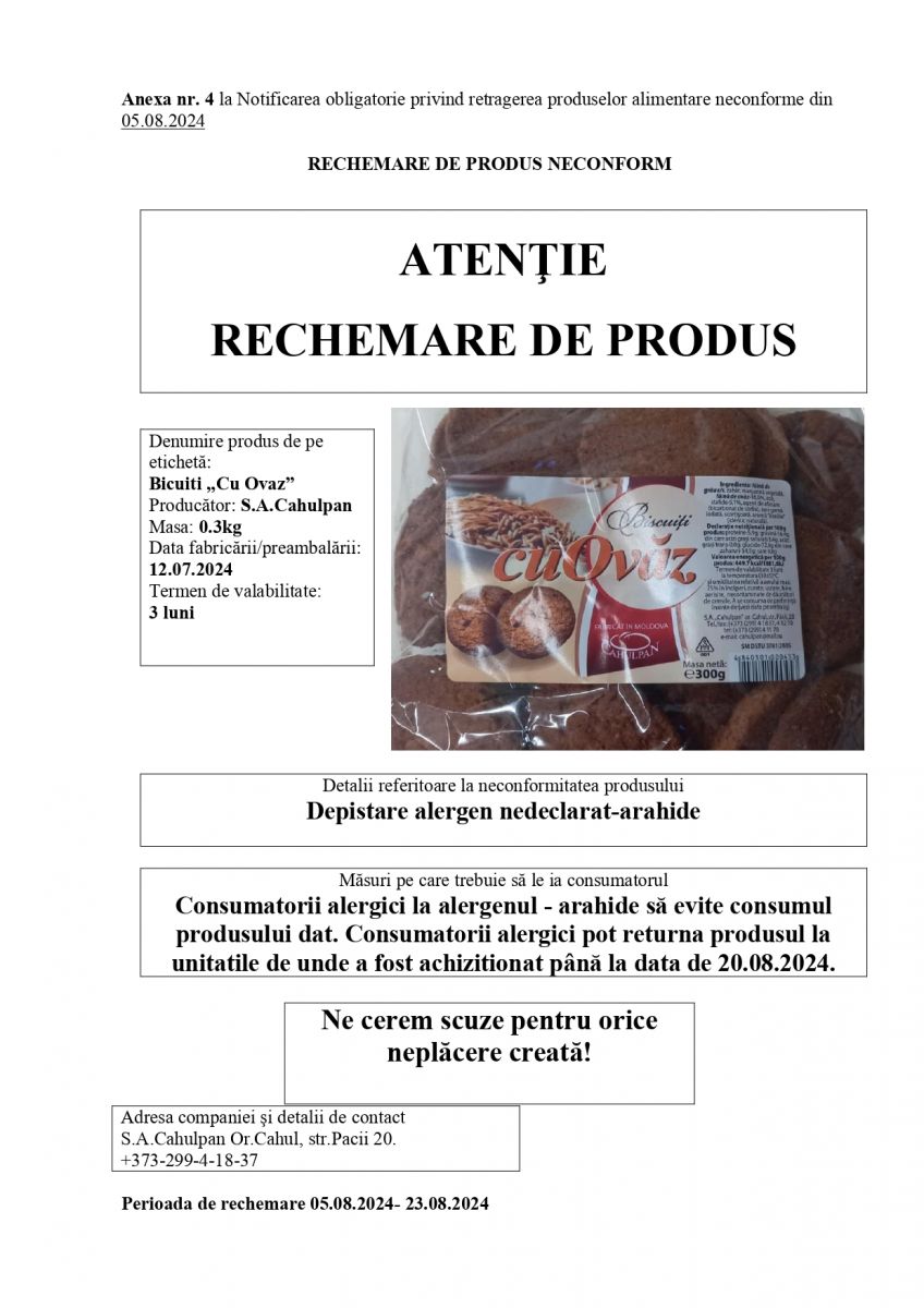 Agenţia Naţională pentru Siguranţa Alimentelor anunță despre rechemarea din comerț a biscuiților cu ovăz.
