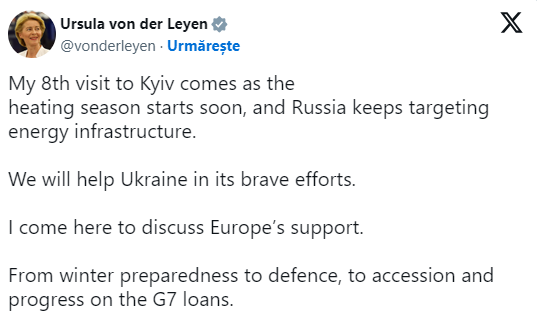 "A opta mea vizită la Kiev survine în contextul în care sezonul rece începe în curând, iar Rusia continuă să ia ca ţintă infrastructura energetică", a scris Ursula von der Leyen pe reţeaua de socializare.