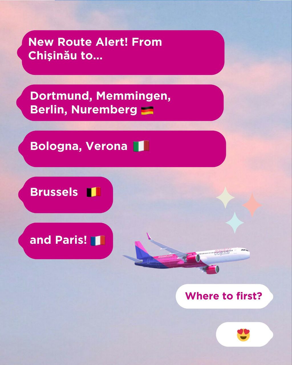 Astfel, destinațiile spre care compania aeriană va avea zboruri de pe Aeroportul Internațional Chișinău sunt Germania - Berlin, Dortmund, Memmingen, Nuremberg; Italia - Verona și Bologna; Franța - Paris; Belgia - Bruxelles.